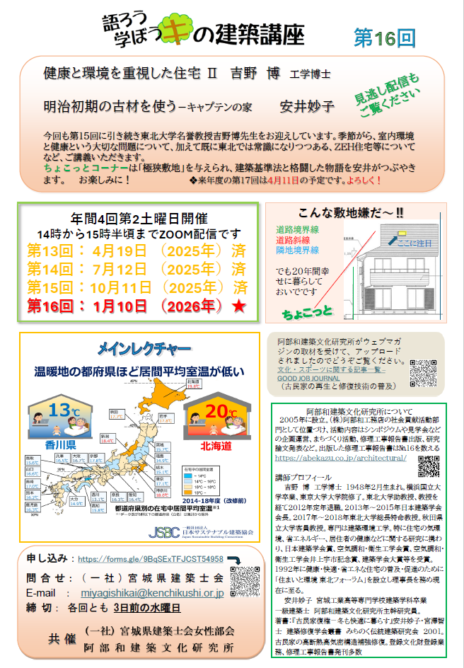 2026年1月10日に宮城県建築士会女性部会・阿部和建築文化研究所共催のオンライン講座 第16回『語ろう学ぼう木の建築講座』を開催致します。By abekazuhp / 2025年12月26日 クリックで拡大します。 2026年1月10日(土)に第16回『語ろう学ぼう木の建築講座』を開催致します。テーマは『健康と環境を重視した住宅Ⅱ』と『明治初期の古材を使う』です。詳細はこちらの案内をご参照ください。参加をご希望の方は案内に記載のURLまたはQRコードよりお申込みください。